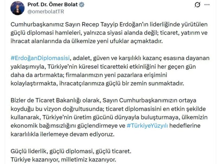 Ticaret Bakanı Ömer Bolat, “Cumhurbaşkanımız Recep Tayyip Erdoğan’ın diplomasisi, adalet, güven ve karşılıklı menfaatler temelinde geliştirdiği yaklaşımıyla...