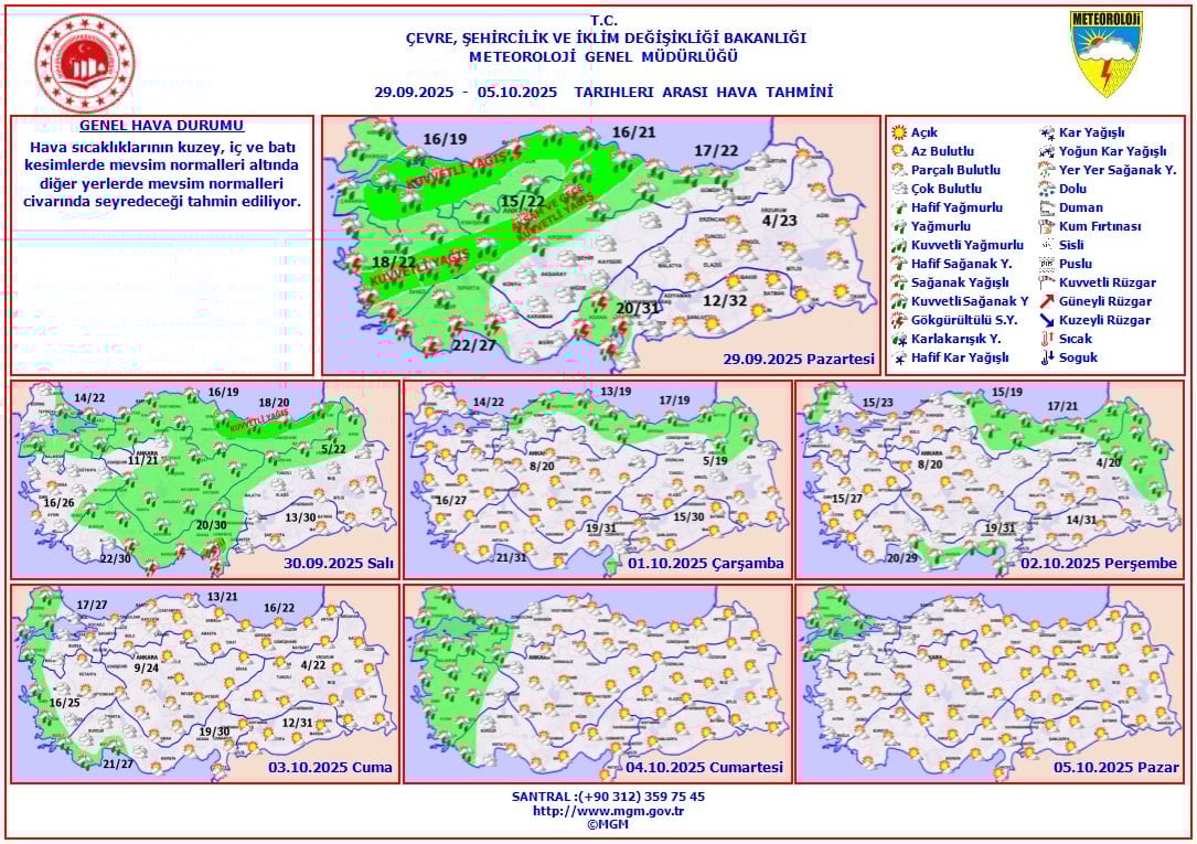 Meteoroloji Genel Müdürlüğü’nden yapılan son değerlendirmelere göre, yeni haftada hava sıcaklıkları kademeli olarak düşmeye devam edecek. Yarın ve salı günü özellikle kuzey ve iç bölgelerde yağışlı hava etkisini gösterecek.